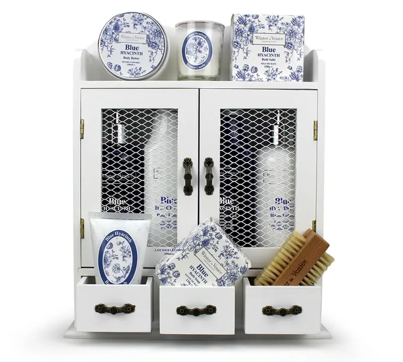 A gorgeous white two-door cabinet filled with a collection of toiletries including body butter, shower gel, body scrub, bath salts and hand & body lotions.All are infused with the scent of Milk Thistle and you will also find a beech nail brush along with a scented candle to help you relax and unwind.